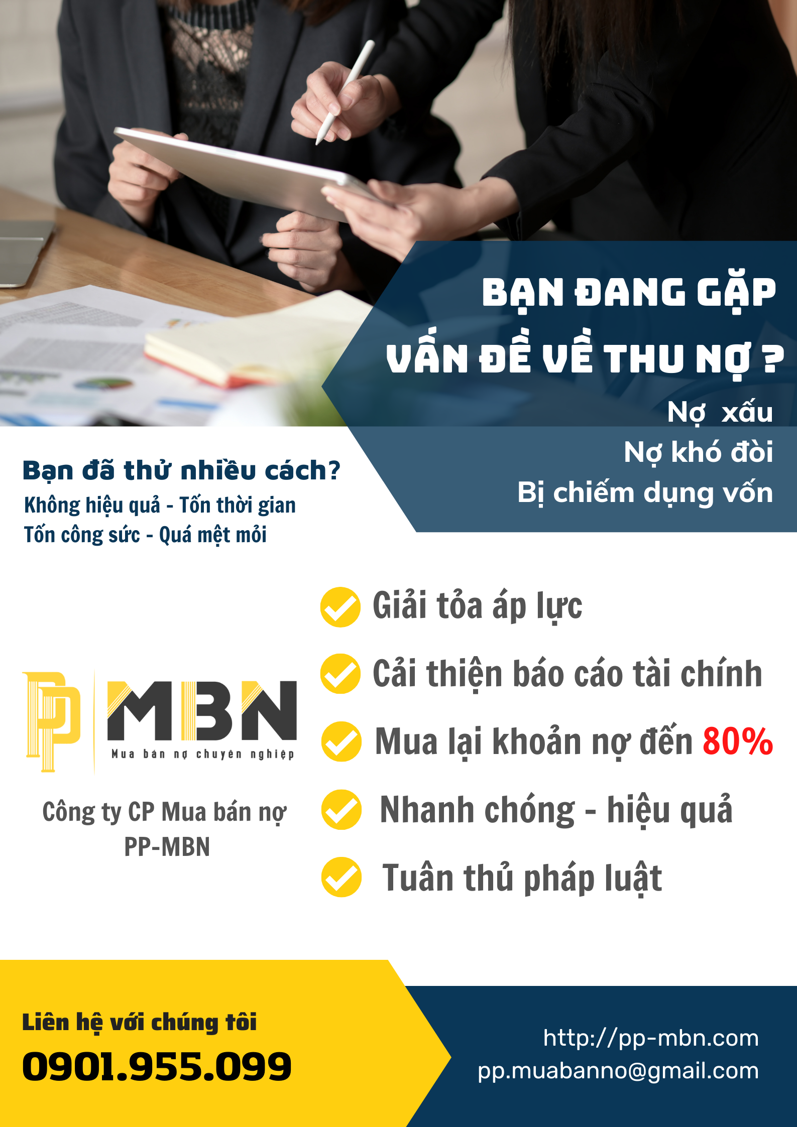 Hiện nay, thị trường dịch vụ mua bán nợ diễn ra khá nhộn nhịp. Tuy nhiên, để lựa chọn cho mình một đơn vị mua bán nợ uy tín, chuyên nghiệp, hoạt động một cách bài bản, tuân thủ quy định pháp luật là điều không dễ. Dưới đây, Toplawvietnam giới thiệu đến Quý bạn đọc Công ty CP Mua bán nợ PP-MBN tại Đà Nẵng, một đơn vị được thành lập và hoạt động bởi đội ngũ nhân sự tâm huyết; am hiểu về pháp luật; được đào tạo chính quy từ các trường Luật trên toàn quốc; đã có nhiều năm kinh nghiệm trong hoạt động thu hồi nợ cá nhân, nợ doanh nghiệp ở nhiều lĩnh vực khác nhau: dân sự, thương mại, xây dựng… Tất cả đều cùng chung một mục tiêu: “Thượng tôn pháp luật – Mang lại lợi ích tốt nhất cho khách hàng”.PP-MBN hoạt động uy tín và hiệu quả, tuân thủ pháp luật và đa dạng phương thức, giúp khách hàng Giải toả áp lực đối với các khoản nợ xấu, nợ khó đòi