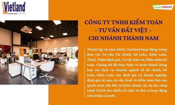 Công ty TNHH Kiểm toán và Tư vấn Đất Việt (Vietland) là Công ty hàng đầu cung cấp Dịch vụ Kiểm toán, Kế toán, Thẩm định giá. Trải qua 20 năm kinh nghiệm trong ngành, Vietland tự hào trở thành đơn vị kiểm toán uy tín được các đối tác lớn trong nước cũng như quốc tế lựa chọn vì luôn giữ vững phương châm kinh doanh: “Lợi ích của Khách hàng là lợi ích của Doanh nghiệp”. Thông qua việc cung cấp các sản phẩm dịch vụ chất lượng, Vietland mong muốn đóng góp một phần công sức vào việc minh bạch hóa số liệu tài chính, giảm thiểu các rủi ro về thuế, đồng hành cùng sự phát triển và thành công của mỗi khách hàng.
